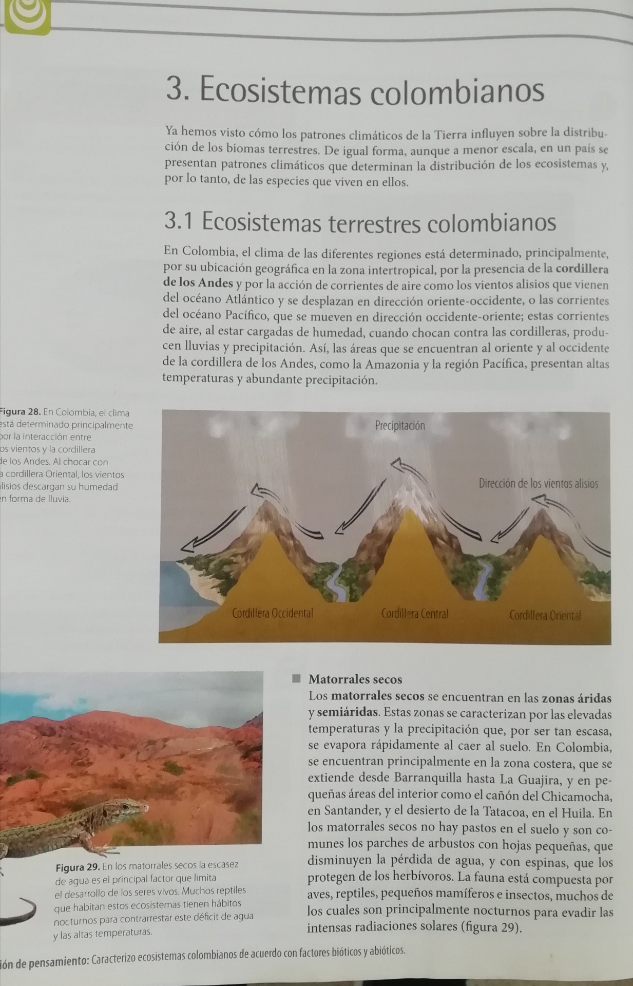 Cada ecosistema presenta un conjunto particular de factores abióticos, como la temperatura, la precipitación, los vientos, la altitud, el suelo y el aire. En Colombia, por ejemplo, las cimas de las altas montañas son frías y secas, las selvas son cálidas y húmedas, y hay lugares muy calientes donde las lluvias son esporádicas y el agua escasea.